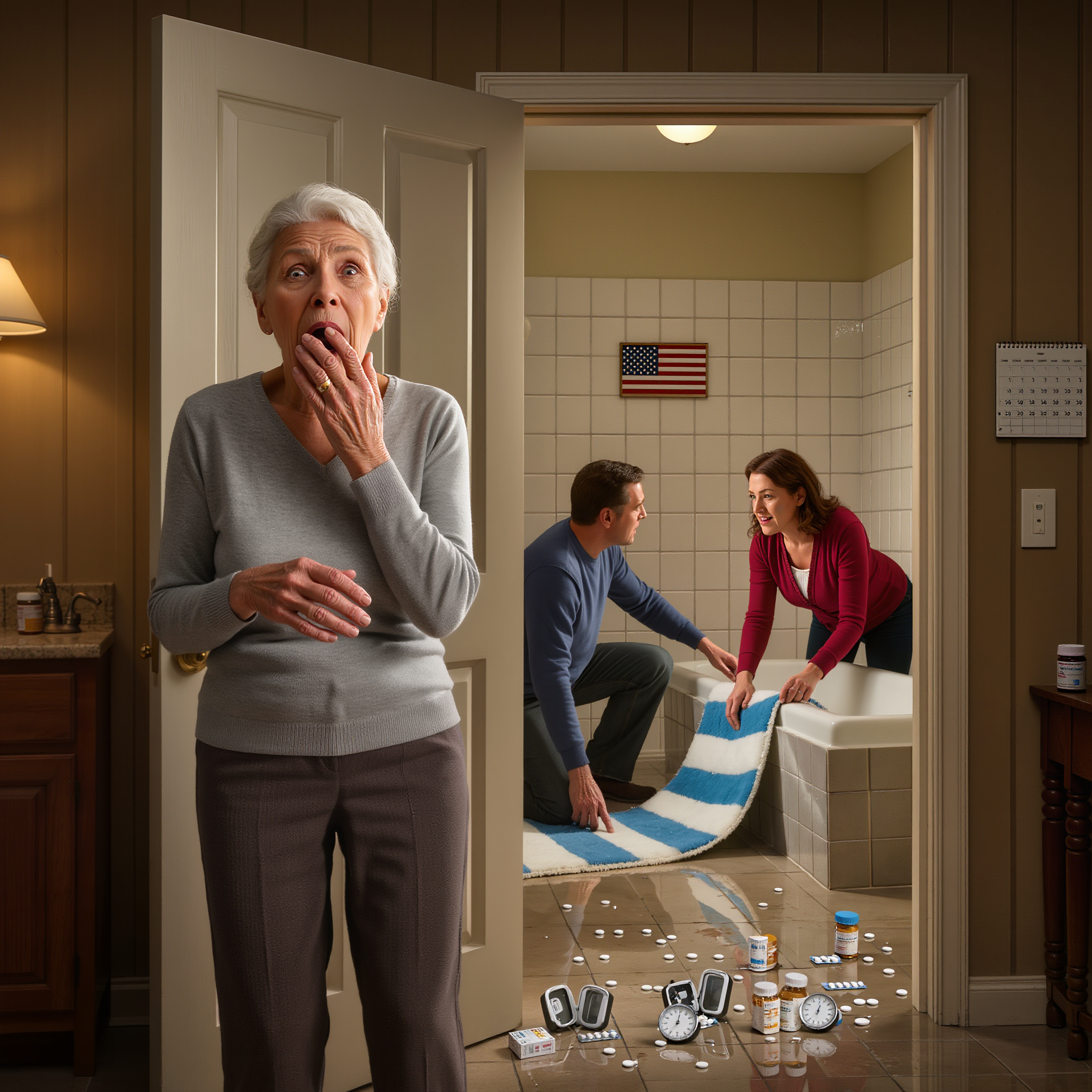 My bathroom floor was soaking wet, water everywhere. Marcus was on his hands and knees, positioning my bathroom rug at an odd angle. Chenise was holding several of my prescription pill bottles, the ones I kept in my medicine cabinet—blood pressure medication, anxiety medication prescribed after my husband Thomas died. The bottles were open, pills scattered across the wet floor.