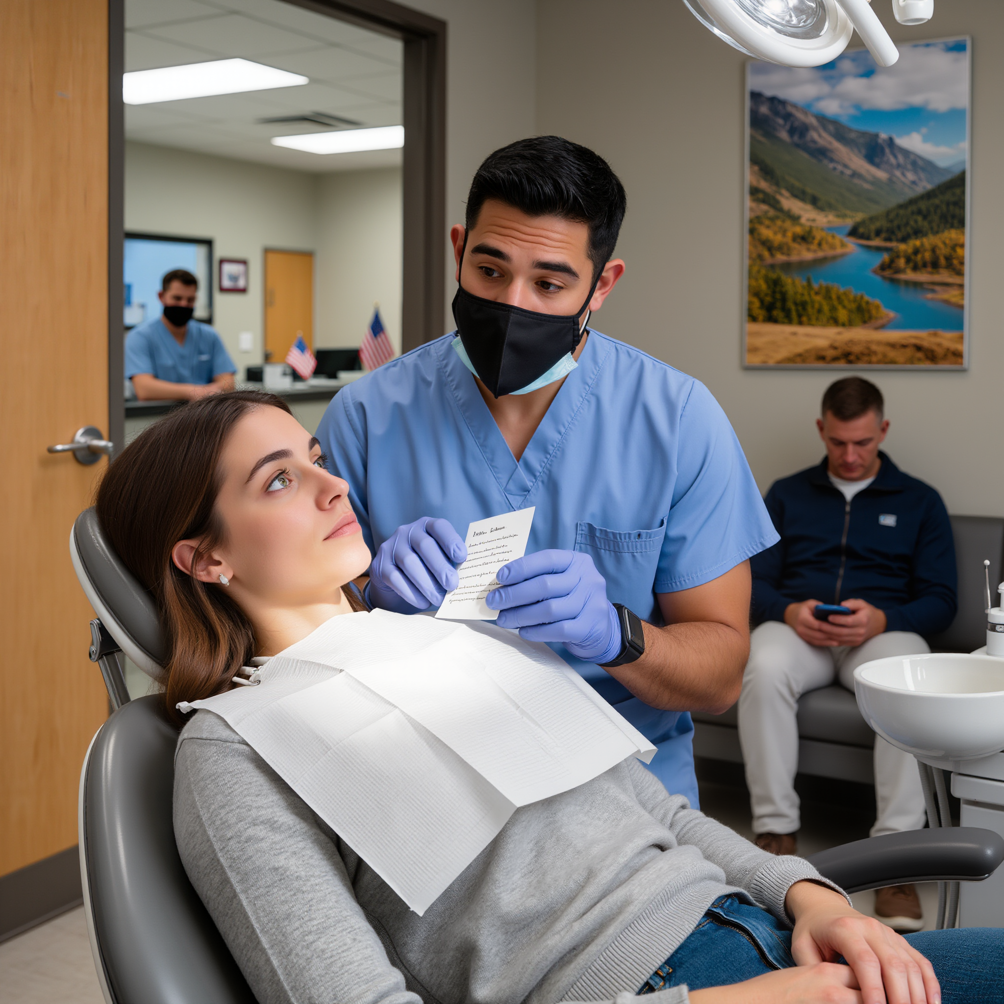 A few minutes later, Dr. Aguilar set down his tools and stepped back from the chair. He picked up a small notepad from the counter—the kind dentists use to write down treatment notes or referral information. He scribbled something quickly, then turned and held it up so only I could see.
