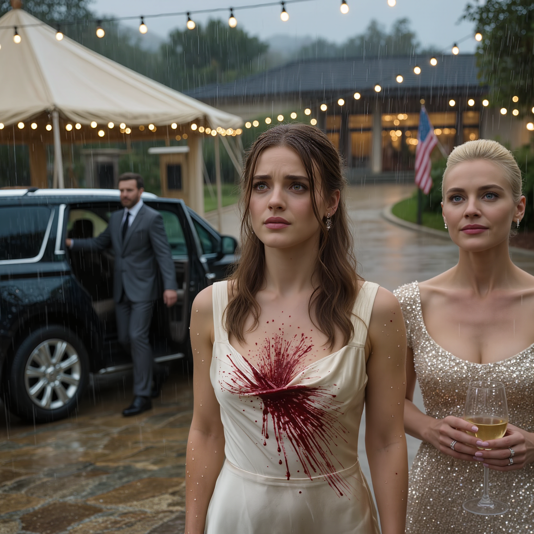 I was walking toward the gravel path, tears blurring my vision, when Caleb’s SUV pulled up. He stepped out, looking like a million dollars in a tailored charcoal suit. He saw me—the wet hair, the wine stained dress—and his face went from calm to lethal in a split second.