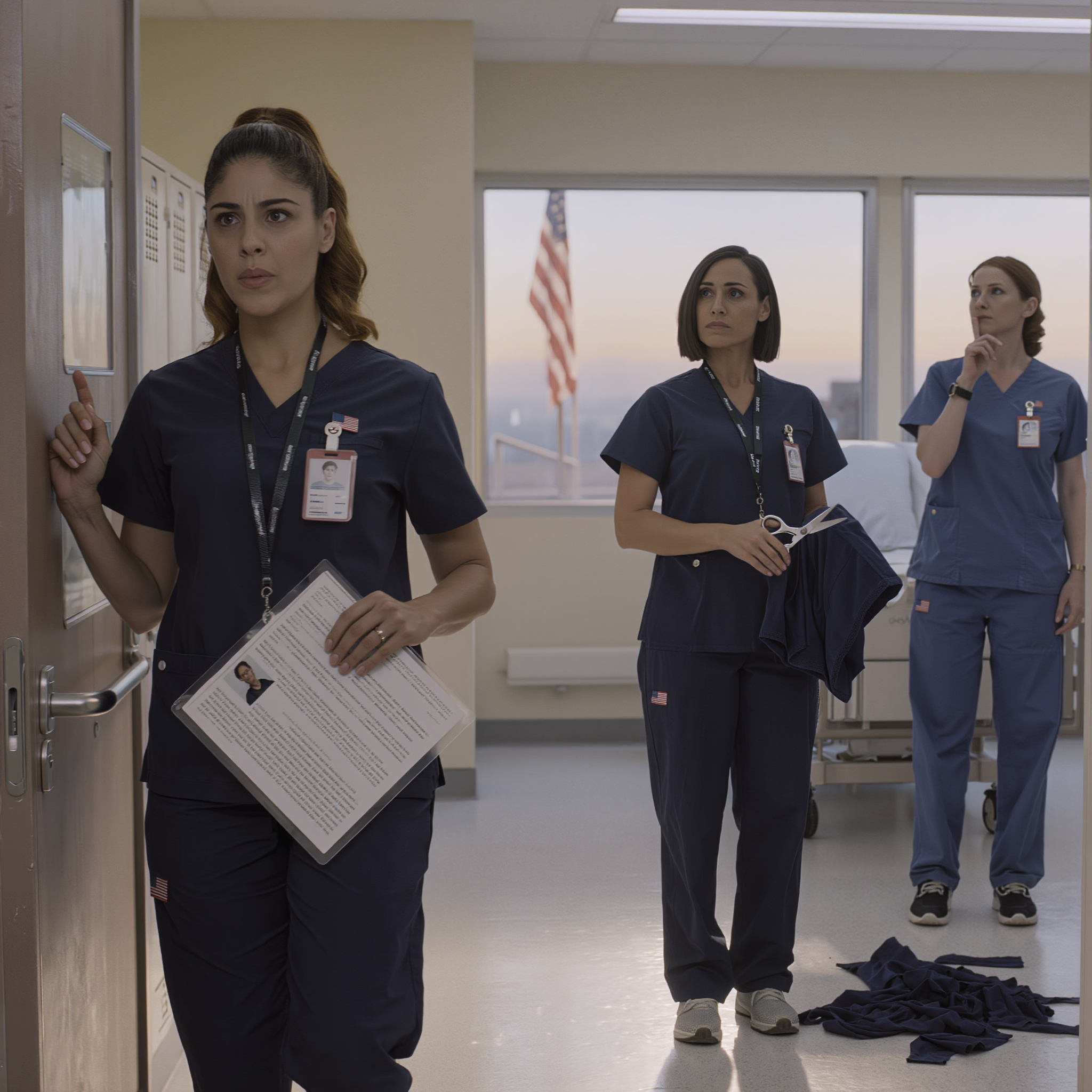 Nicole spun so fast she nearly dropped the scissors. The color drained from her face in seconds, leaving her as pale as the destroyed scrubs at her feet.