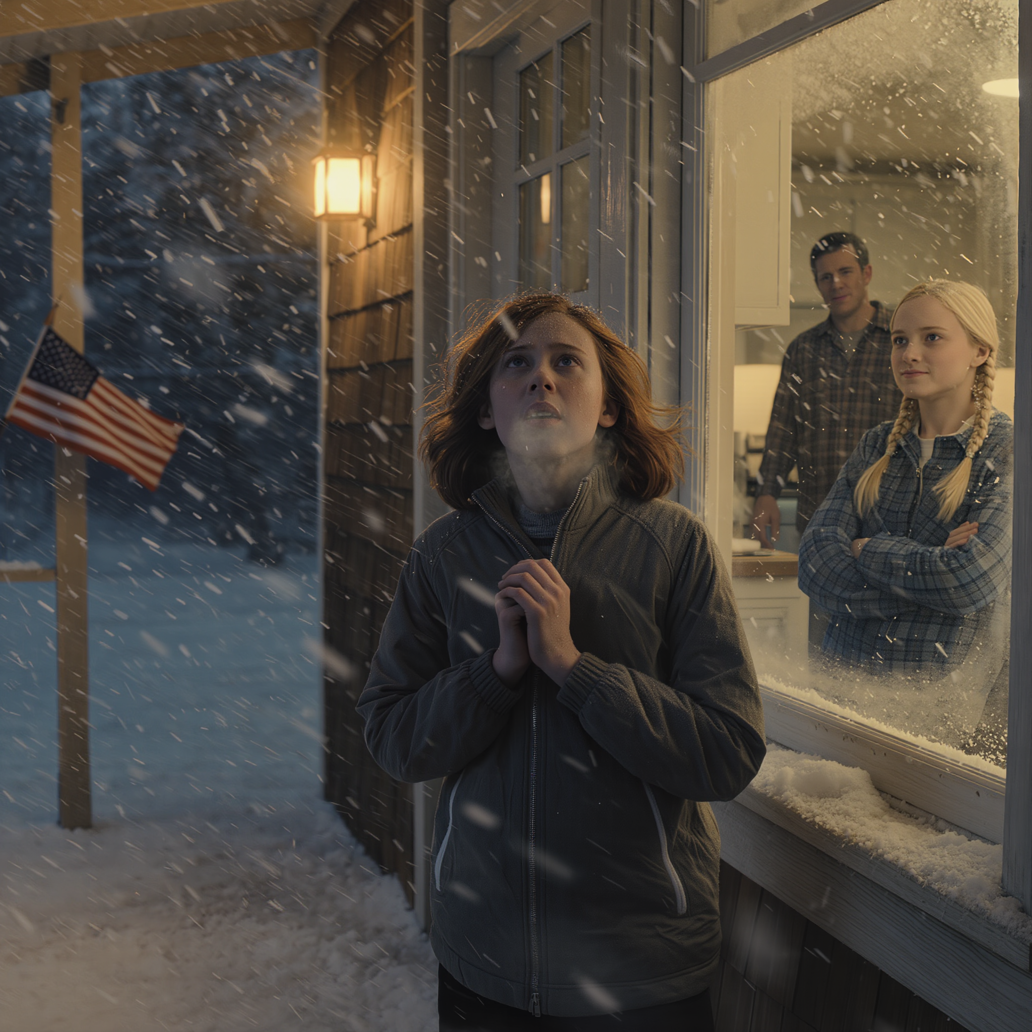 The door slammed behind me, a sound so final it seemed to echo not only through the blizzard outside but deep within my chest, rattling bones I hadn’t even realized were tense. The cold hit immediately, biting through the thin jacket I had worn home from school, searing against the warmth my body had clung to all day. My bare feet pressed into icy snow, and for a moment the world narrowed to the bitter wind shredding my cheeks and the sound of my own heartbeat hammering in my ears. Through the frozen panes of the living room window, I caught sight of Hannah, my sister, and her lips curled into that slow, deliberate smirk I had come to fear—her triumph clear, almost tangible, as she turned away, leaving me for the storm to claim.