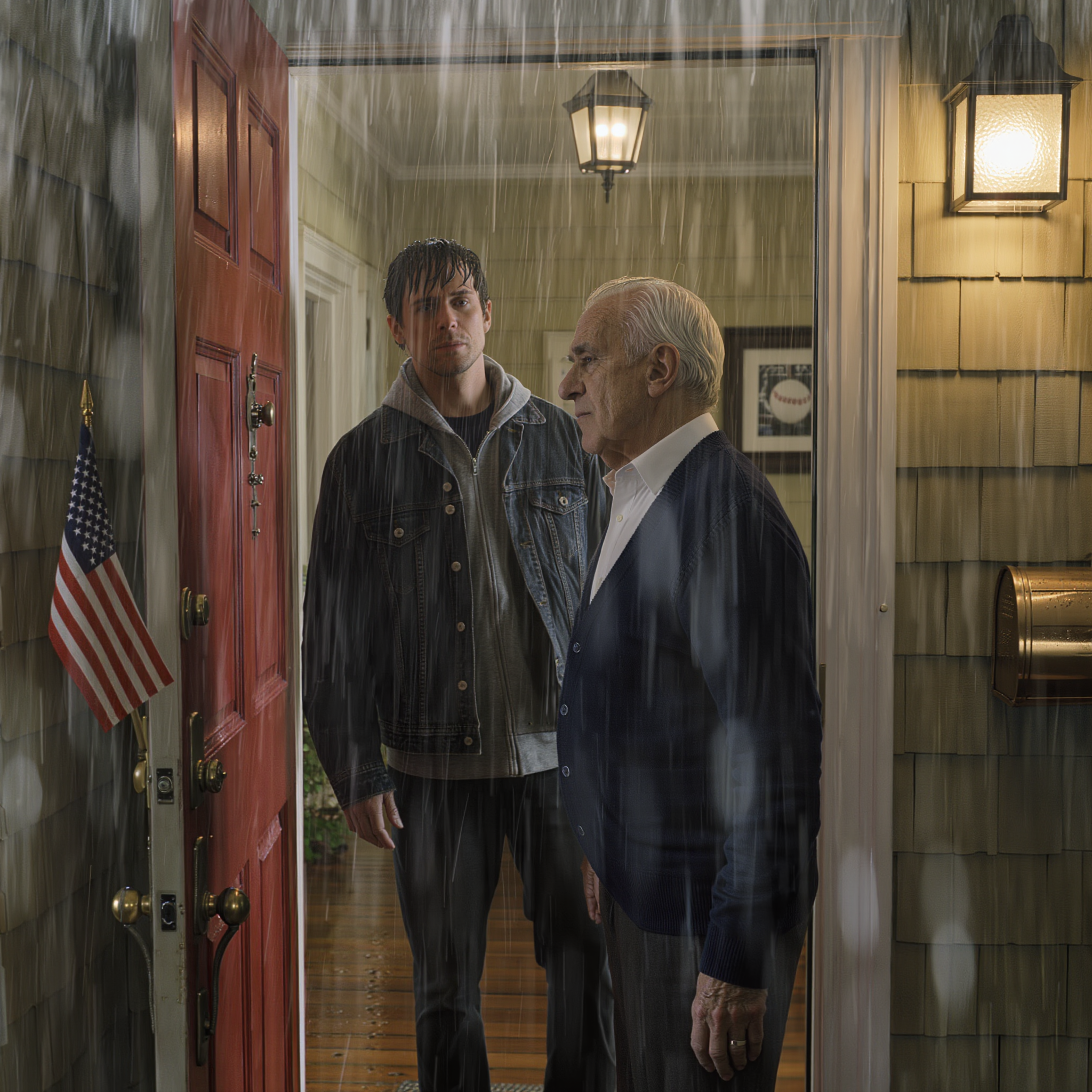 The porch light illuminated a figure standing in the rain. Young—maybe late twenties—soaked to the bone and shivering violently. Dark hair plastered to his forehead, wearing clothes that hung on a too-thin frame.