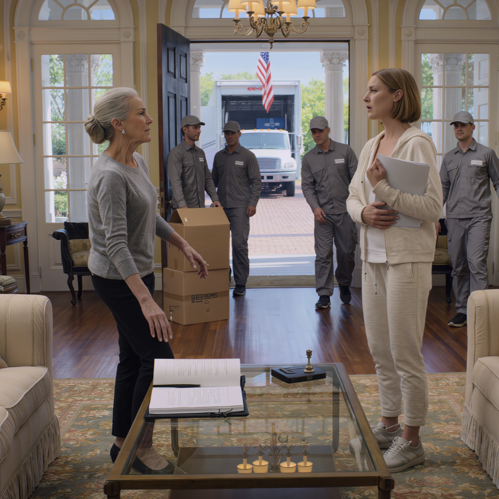 Three large men in work clothes stood behind her, shifting their weight uncomfortably. Through the window, I could see the moving truck in my circular driveway, its engine rumbling low.