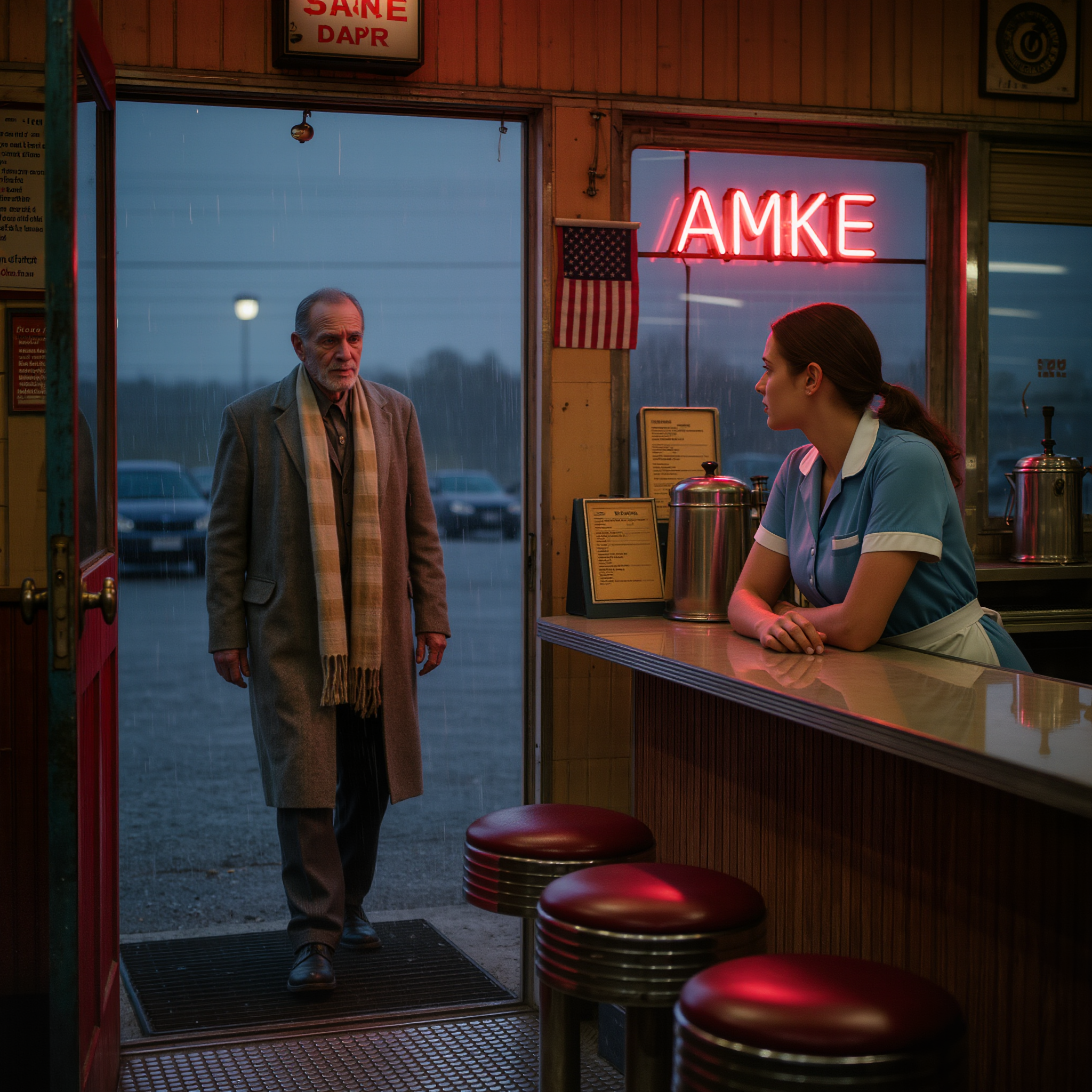 Under the buzzing neon lights of a lonely roadside diner in Ohio, the kind of place travelers pulled into when the interstate stretched too long and too empty, a young waitress scrubbed at the counter as if polishing it could change her life. Grease lingered in the air, mixed with the faint aroma of burnt coffee sitting too long on the warmer. Outside, a semi roared past on the highway, its headlights slicing through the November night before disappearing back into the dark. Inside, the clock ticked toward closing.
