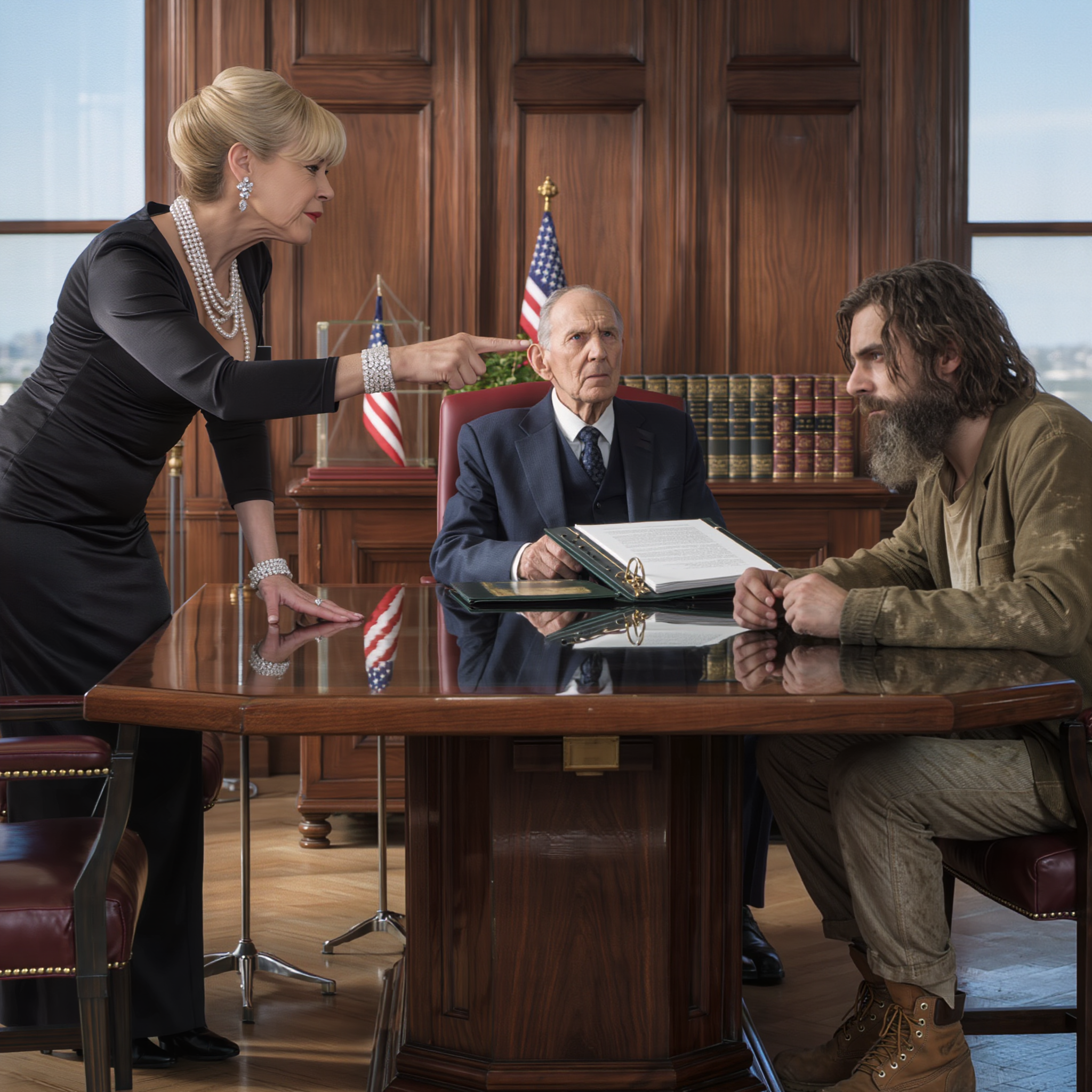 “Gus, why is this vagrant in the room?” she demanded, gesturing toward the man. “I told you this was a private family matter. I won’t have the Sterling name tarnished by the presence of… whatever that is. He looks homeless! Lacy, Trevor, keep your bags close. He’s probably here to beg for a handout.”